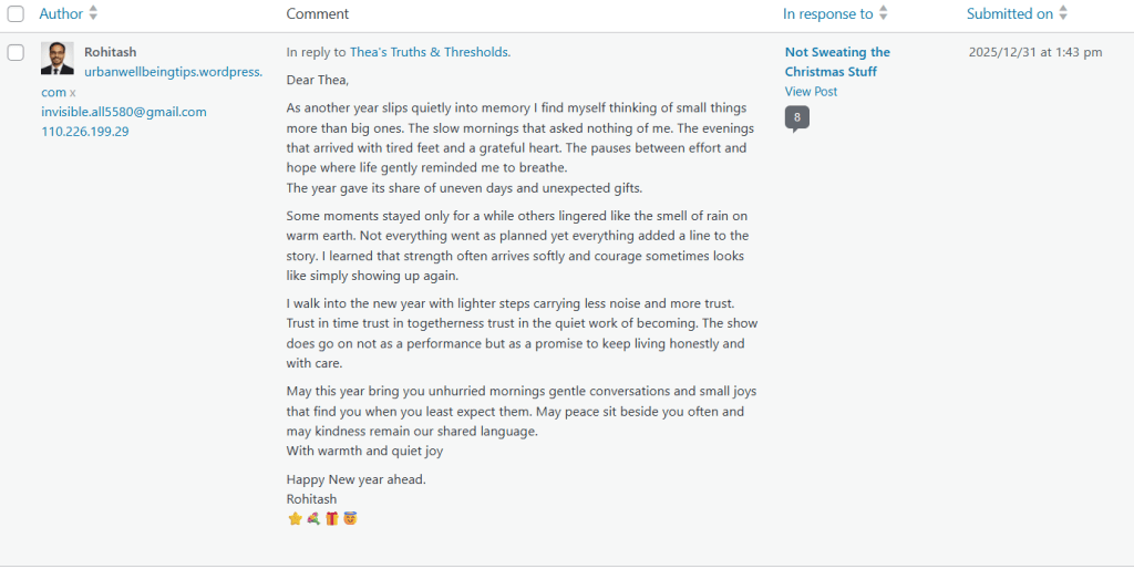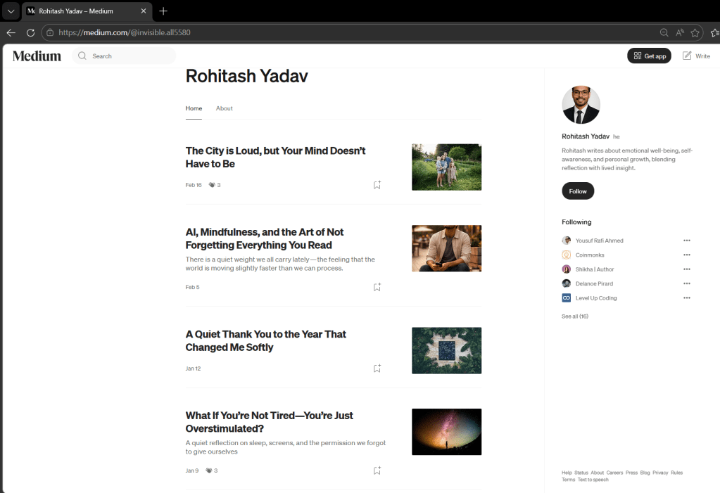 Rohitash Yadav of Urban Wellbeing Tips, the wellness blogger referenced in my December 29, 2025 reflection, titled, When My Clarity Doesn’t Need Permission has recently revised the “About” section of his platform. Phrases previously used to project a guru‑like authority — including “Sanctuary of Peace,” “embodies wellness in every word,” and “readers trusting him more than themselves” — have been removed. The writing approach is now framed as “coming from sincerity — not performance,” cited as the reason readers resonate with his work.